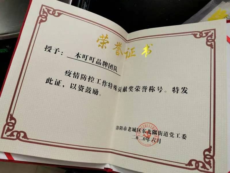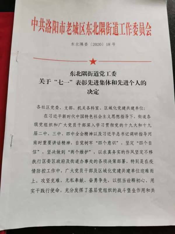 荣获洛阳市老城区东北隅街道党委政府荣誉证书