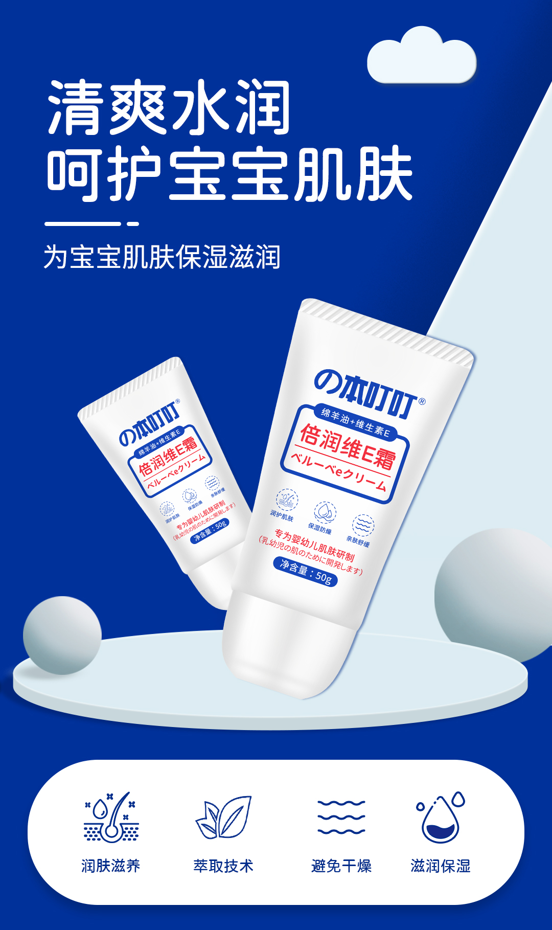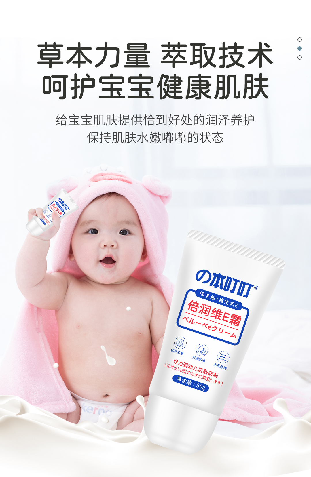 滋润的霜状质地,肤感温和,涂抹上手能感受到绵羊油和维生素E给予肌肤的深层呵护,就如妈妈在温柔地呵护宝宝肌肤