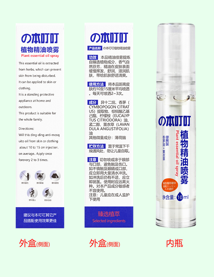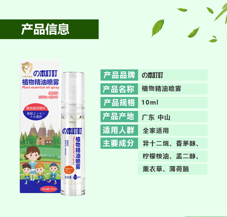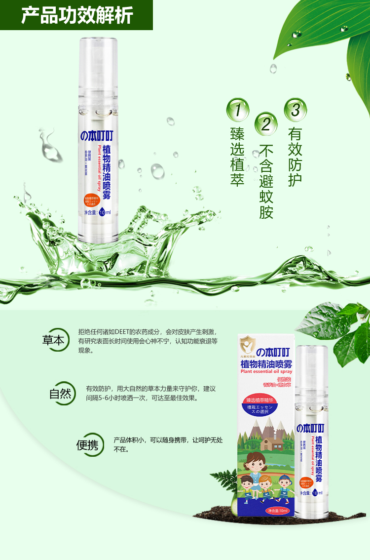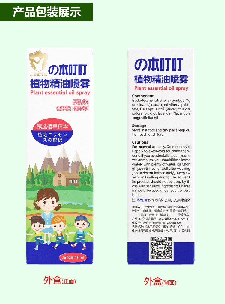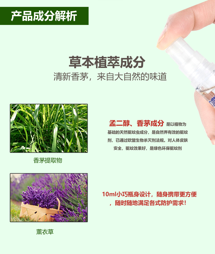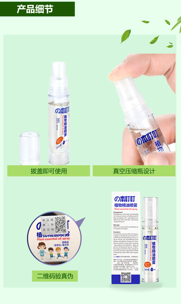 天然植物成分提炼而成,散发香茅草和香薰草自然清香,不添加DEET和驱蚊脂,温和亲肤安心驱蚊,具有国家药监局儿童化妆品权威备案的小金盾标识,强力安全保障,采用真空喷头的贴心设计,直接喷散皮肤或衣物即可畅享6小时长效防护