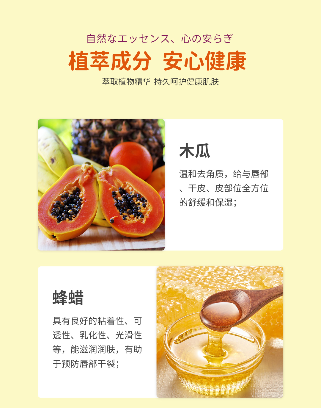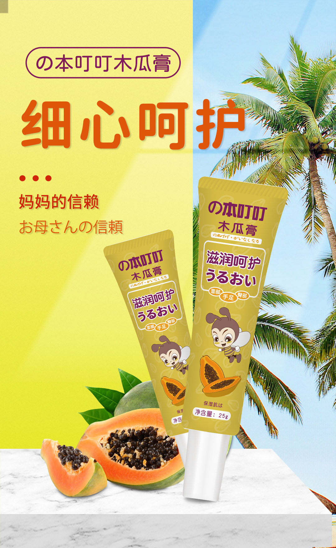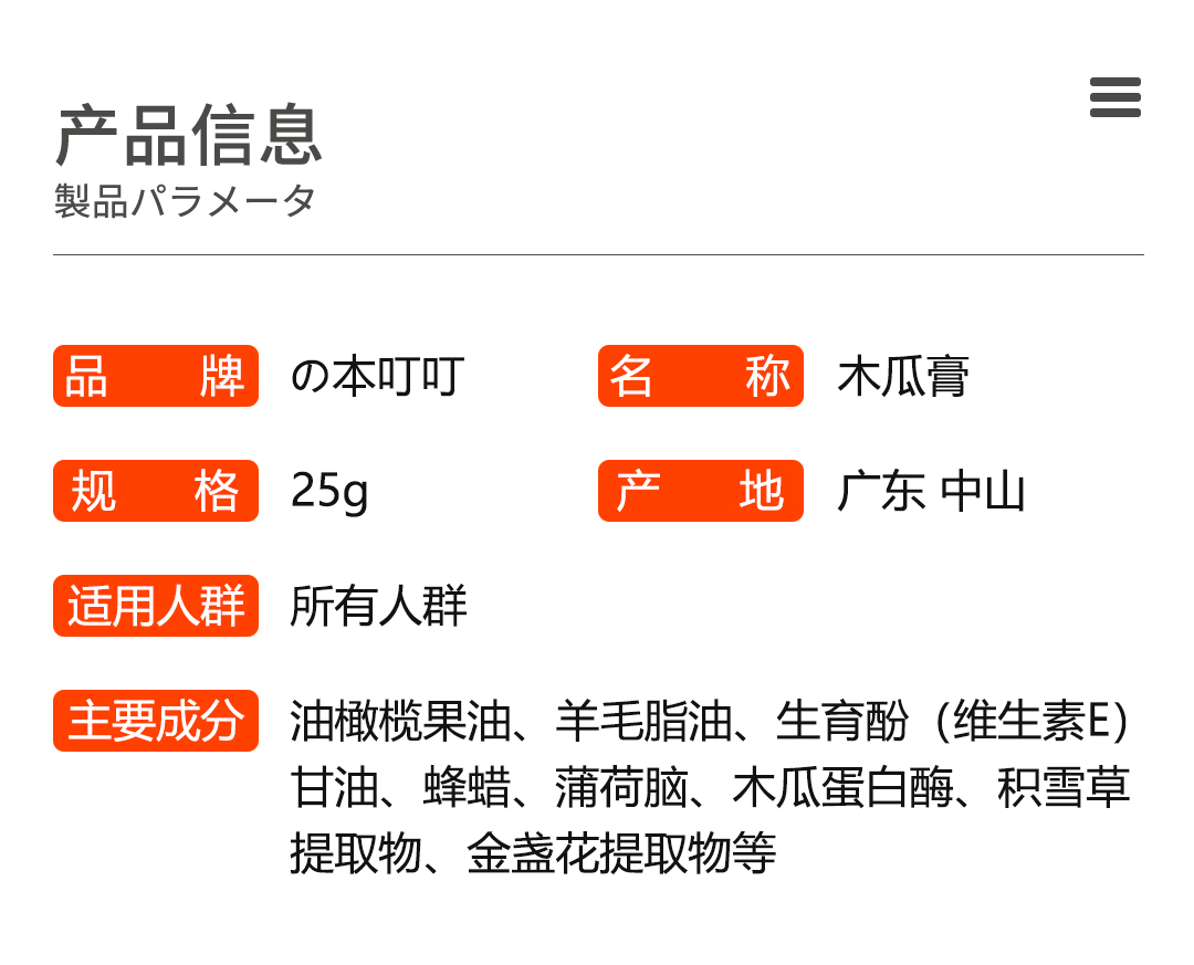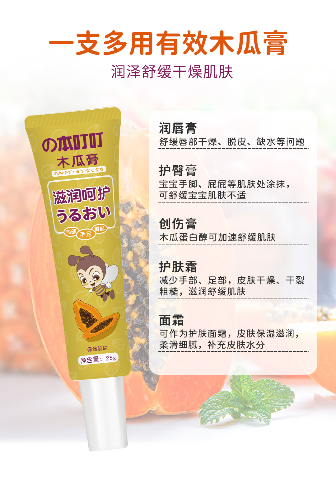 天然植物提取,富含油橄榄果油、甘油、维生素E、蜂蜡、木瓜蛋白酶、积雪草草本成分,解决痤疮、烧伤、擦伤、割伤、皱裂、皮疹、碎片、开放性伤口的皮肤难题,对昆虫叮咬和尿布疹的皮肤修复效果明显,还可作为护唇膏和护手足膏,防止皮肤干裂